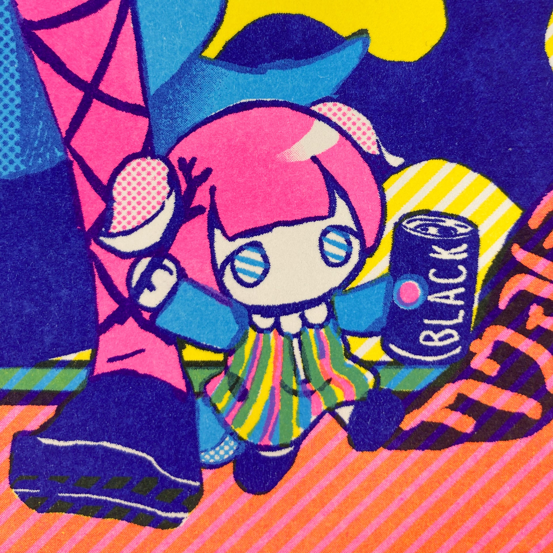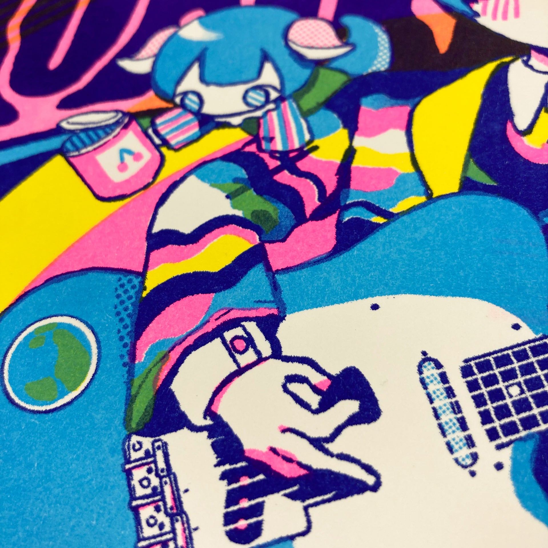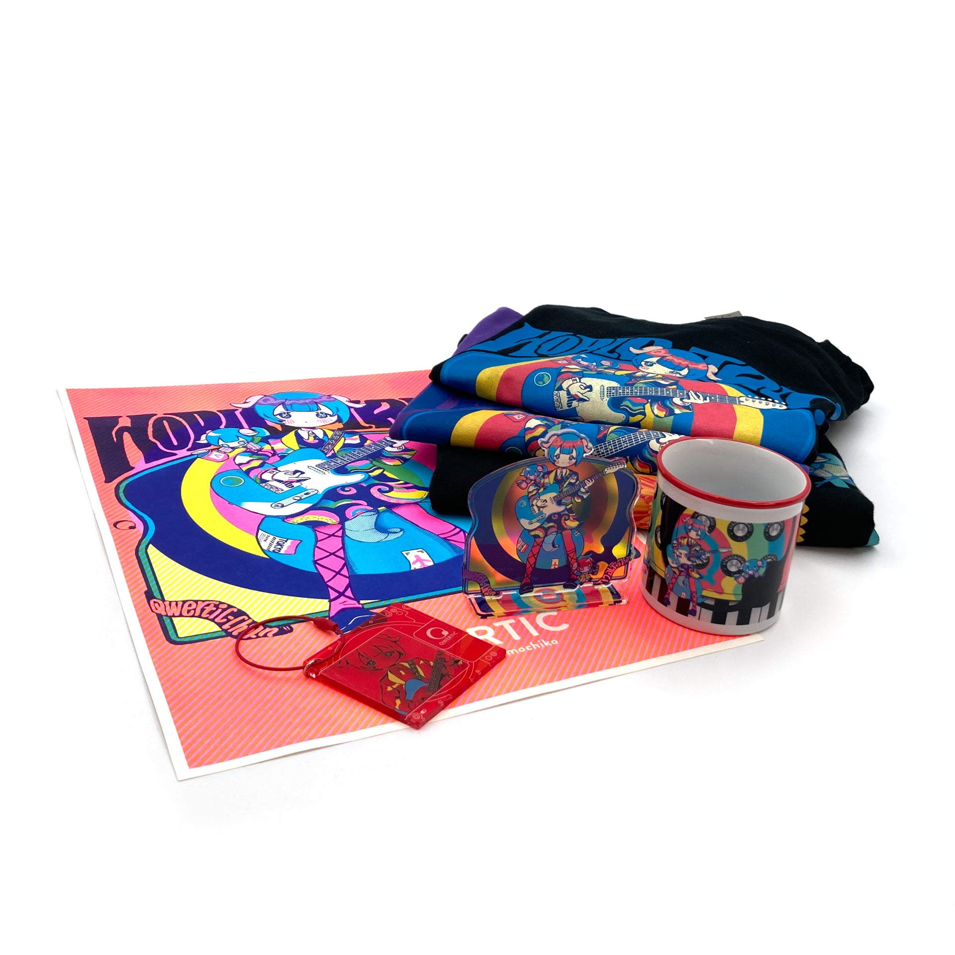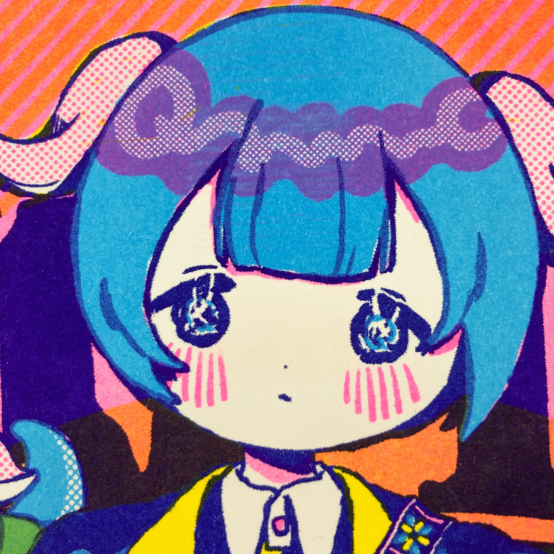 Bring some groovy charm to your space with this vibrant risograph poster featuring the adorable Qwertic-chan, illustrated by Ancoro Mochico-sensei!